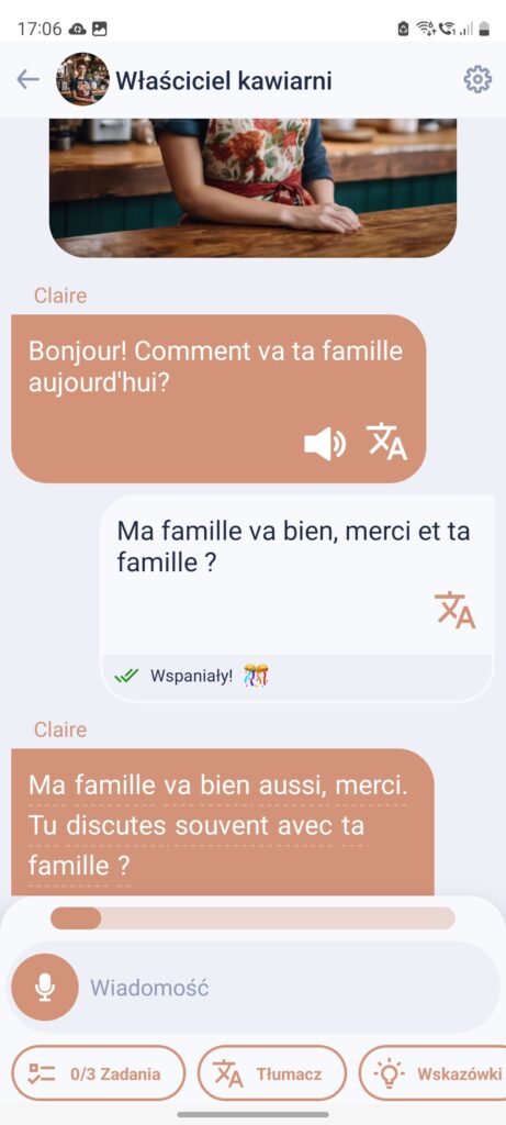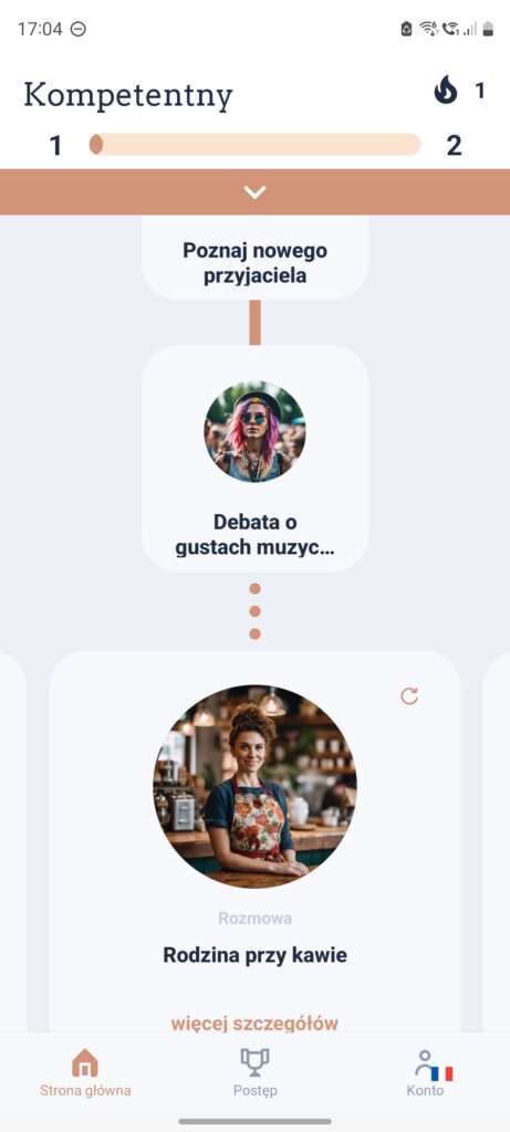 Motywację zapisałam z wykrzyknikiem, bo przy samodzielnej nauce języka jest to kluczowa cecha aplikacji, czyli z angielskiego taki „must have”. Ta aplikacja to oferuje poprzez poziom postępu określonych umiejętności, który zwiększa się z każdą przeprowadzoną rozmową, aż do przeskoczenia na wyższy poziom. Każda rozmowa ma też punkt końcowy, nie ciągnie się w nieskończoność.