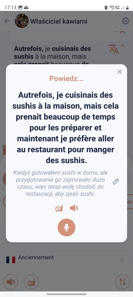 Zarówno wypowiedzi lektora, jak i Twoich (po to, że jeśli AI źle Cię zrozumie lub poprawi, to widzisz, jeśli przypadkiem zmienił się sens). Dodatkowo otrzymujesz wbudowany słownik, co jest ekstra rozwiązaniem, bo w końcu często brakuje nam „tego jednego słówka”. Tu mamy wszystko pod ręką. I wszystko jest tłumaczone na polski.