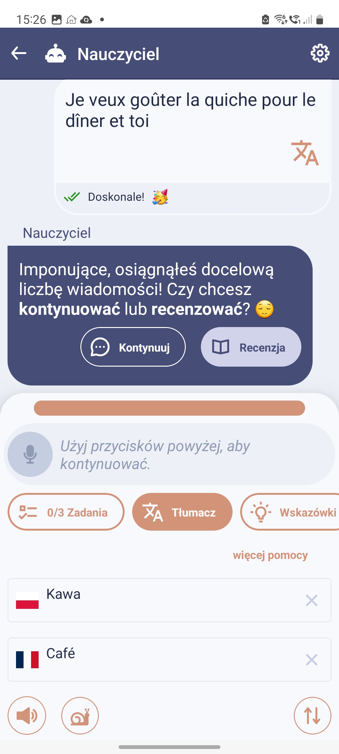 Zarówno wypowiedzi lektora, jak i Twoich (po to, że jeśli AI źle Cię zrozumie lub poprawi, to widzisz, jeśli przypadkiem zmienił się sens). Dodatkowo otrzymujesz wbudowany słownik, co jest ekstra rozwiązaniem, bo w końcu często brakuje nam „tego jednego słówka”. Tu mamy wszystko pod ręką. I wszystko jest tłumaczone na polski.