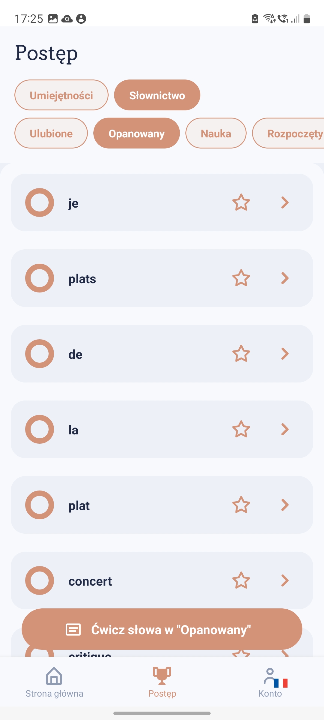 W każdej chwili możesz zajrzeć do zakładki ze słownictwem, które używasz w aplikacji Univerbal. Dzięki temu widzisz, jak rośnie Twoje słownictwo. Możesz też ćwiczyć słówka, także fiszki tworzą się za Ciebie same.