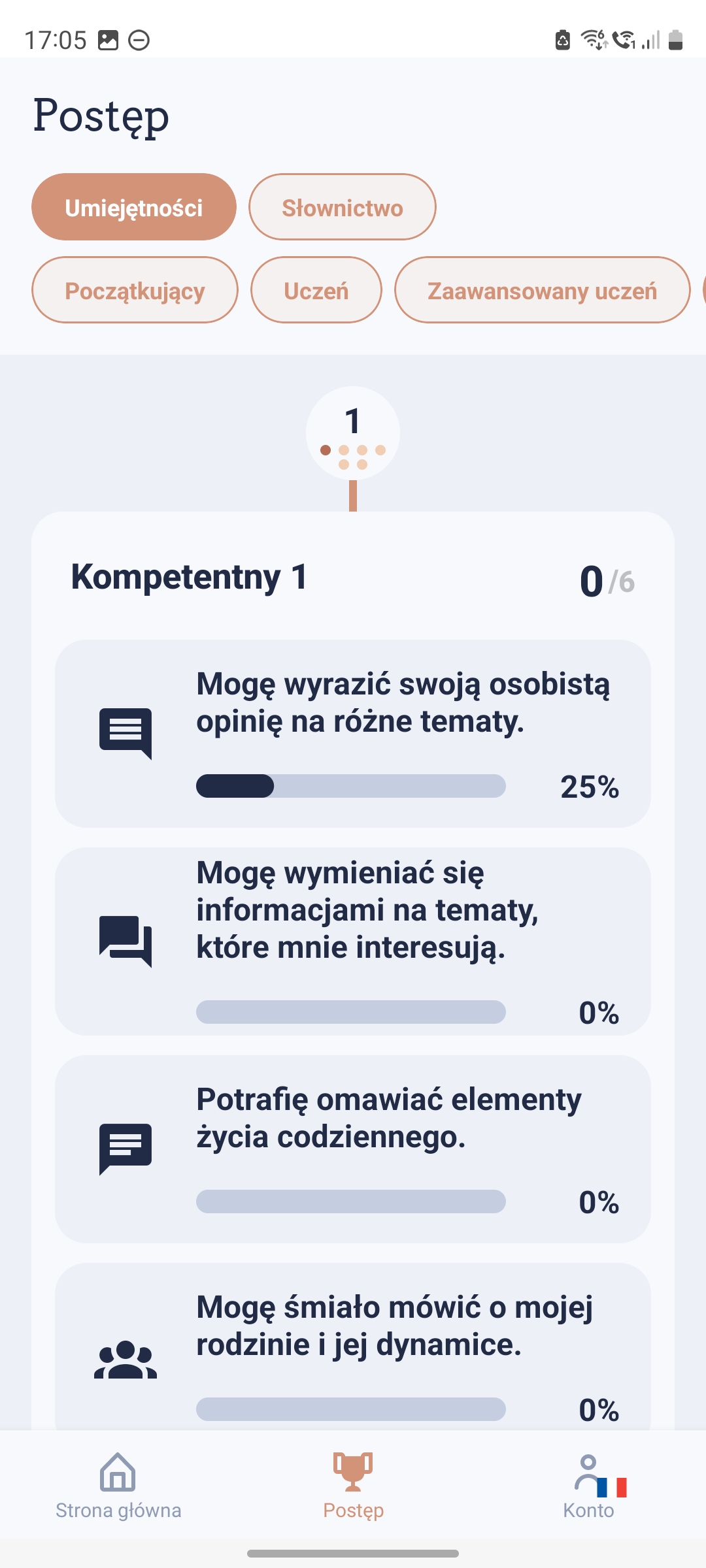 Dostępne poziomy to od początkującego do biegłości.